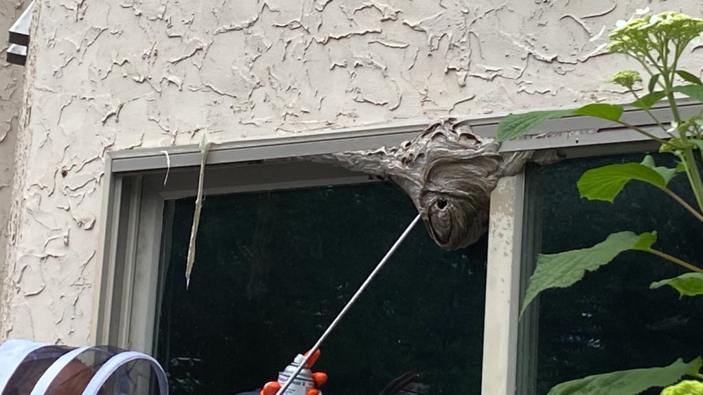 Bald-faced hornets are large wasps that build a nest quickly. Additionally, they build up a large population quite rapidly. They typically build their nests into landscaping, but this one would be on the home just above a bush. I rearranged my schedule to join in the fun.